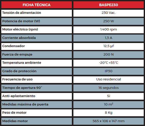 KIT DE UN MOTOR BASPE230 PARA PUERTAS BASCULANTES CONTRAPESAS DE 230Vac., PARA APERTURA INTERIOR.