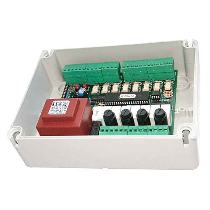 CUADRO DE CONTROL DE 230 Vac. DE 375 W. CON RECPETOR 433.92 MHz EVOLUTIVO, PARA CONTROL DE CUATRO (4) MOTORES TUBULARES DE PERSIANAS DOMÉSTICAS O TOLDO, CON SALIDA PARA SENSOR DE SOL, VIENTO Y LLUVIA.
