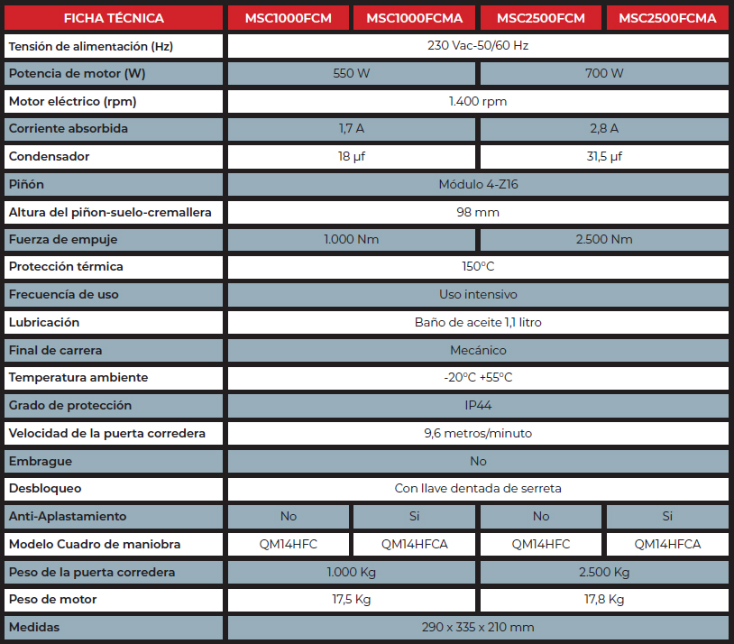 MSC1000FCMA: Para puertas de 1000 Kgs, con cuadro de control QM1H4FCA, con Anti-Aplastamiento.